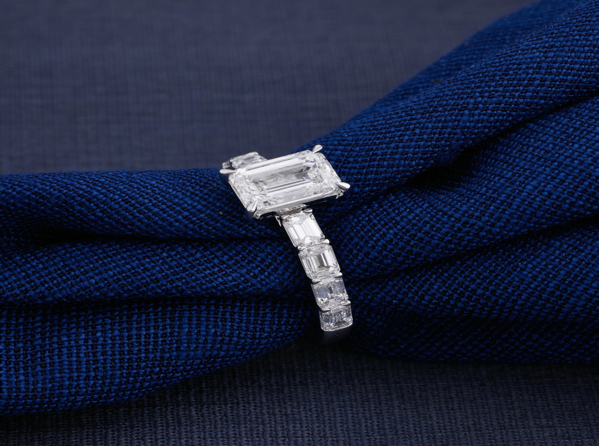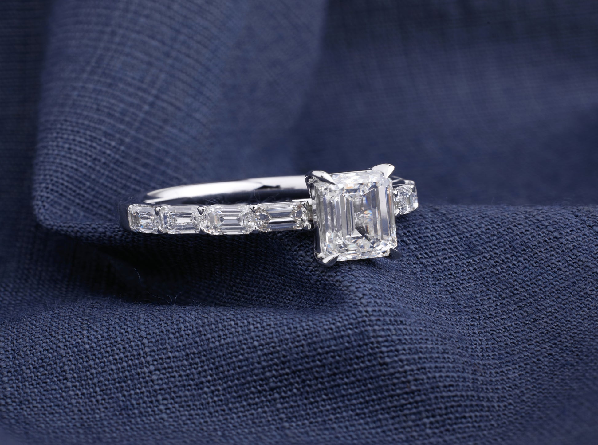 A symphony of elegance and precision, the Celestia Ring is crafted for moments that deserve to last forever. At its heart lies a radiant emerald-cut lab-grown diamond, commanding attention with its elongated sparkle and sophisticated lines. The band is accented with a series of horizontally-set emerald-cut side stones, creating a seamless stream of brilliance across the finger.