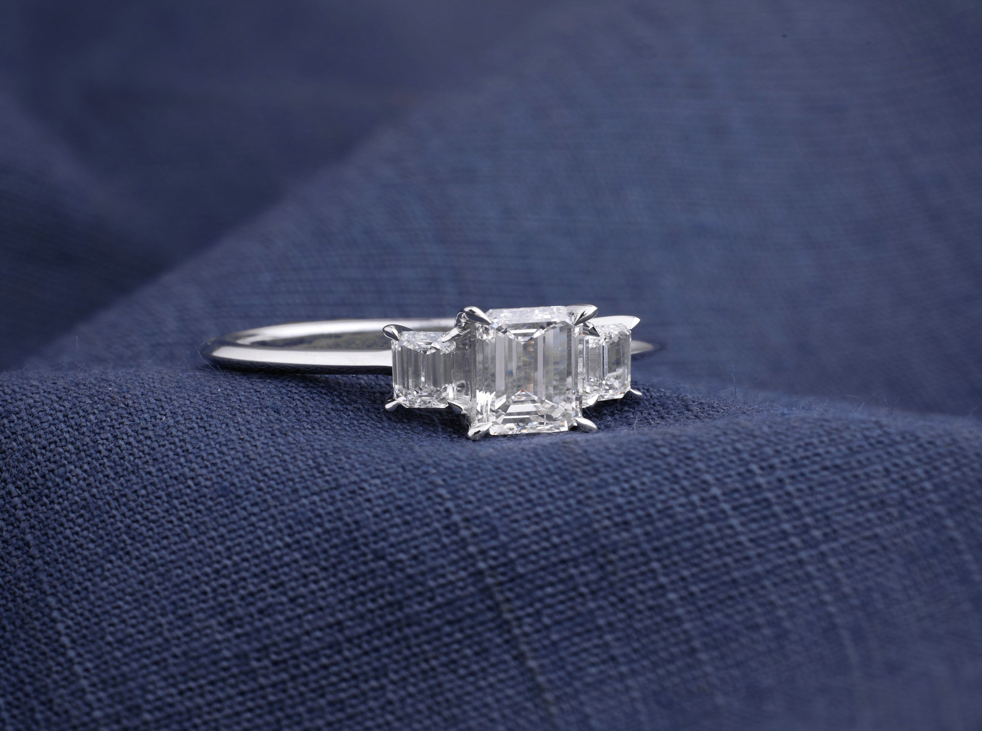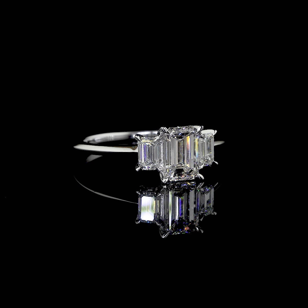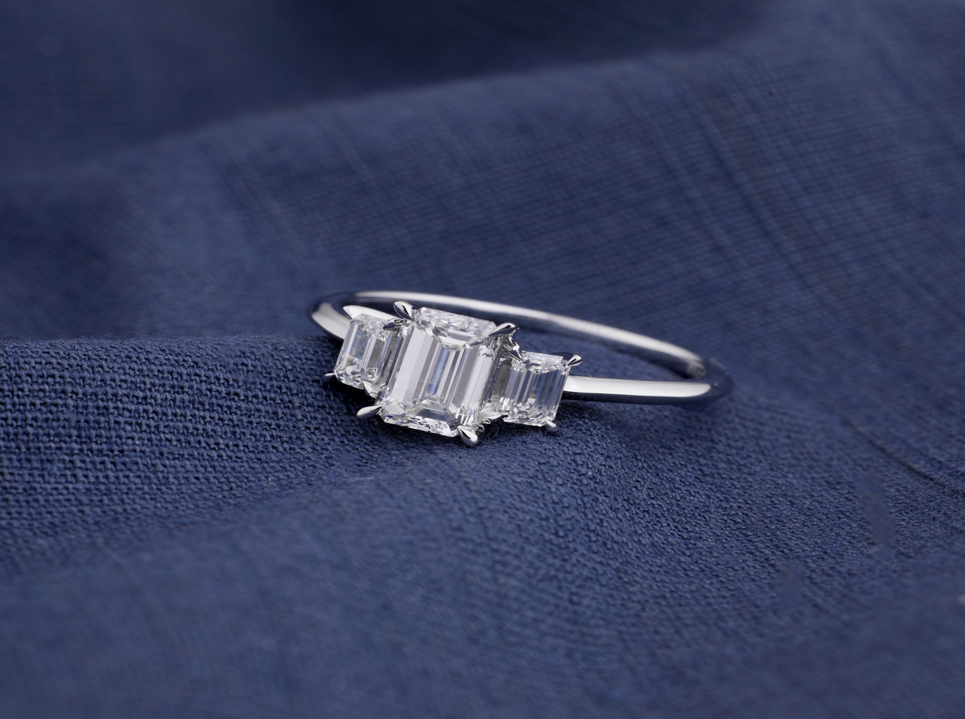 Celebrate your journey with the Trinity Ring — a striking trio of emerald-cut lab-grown diamonds that symbolize a love story told in three chapters: yesterday’s memories, today’s promises, and tomorrow’s dreams. The center stone commands attention with its elongated facets, flanked gracefully by matching emerald side stones that mirror its clarity and elegance.
