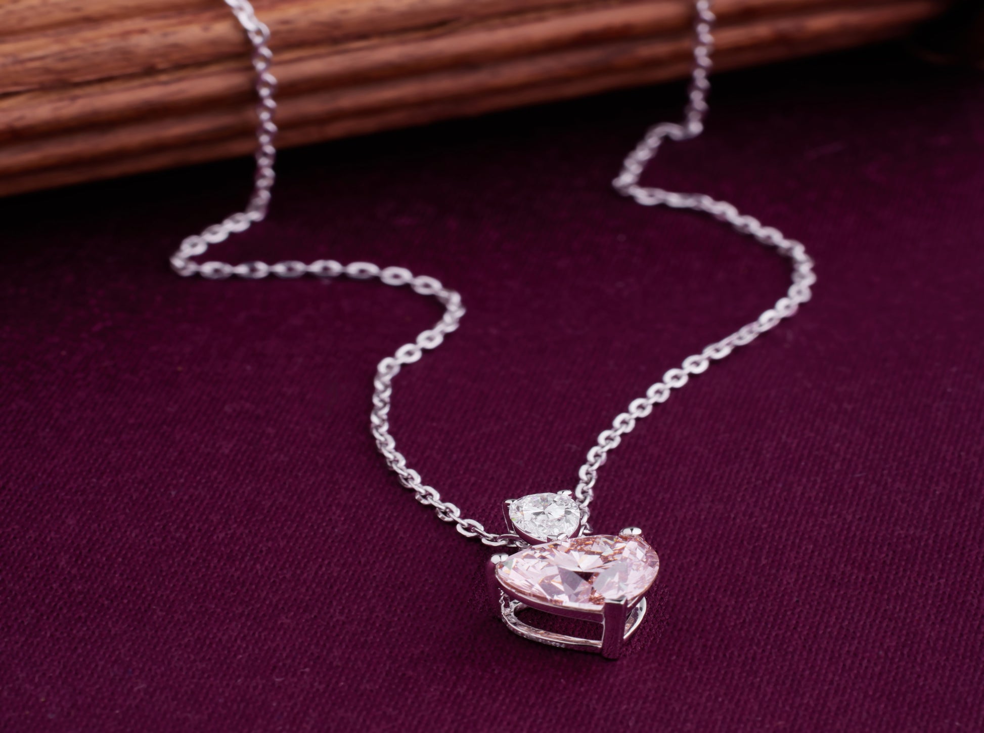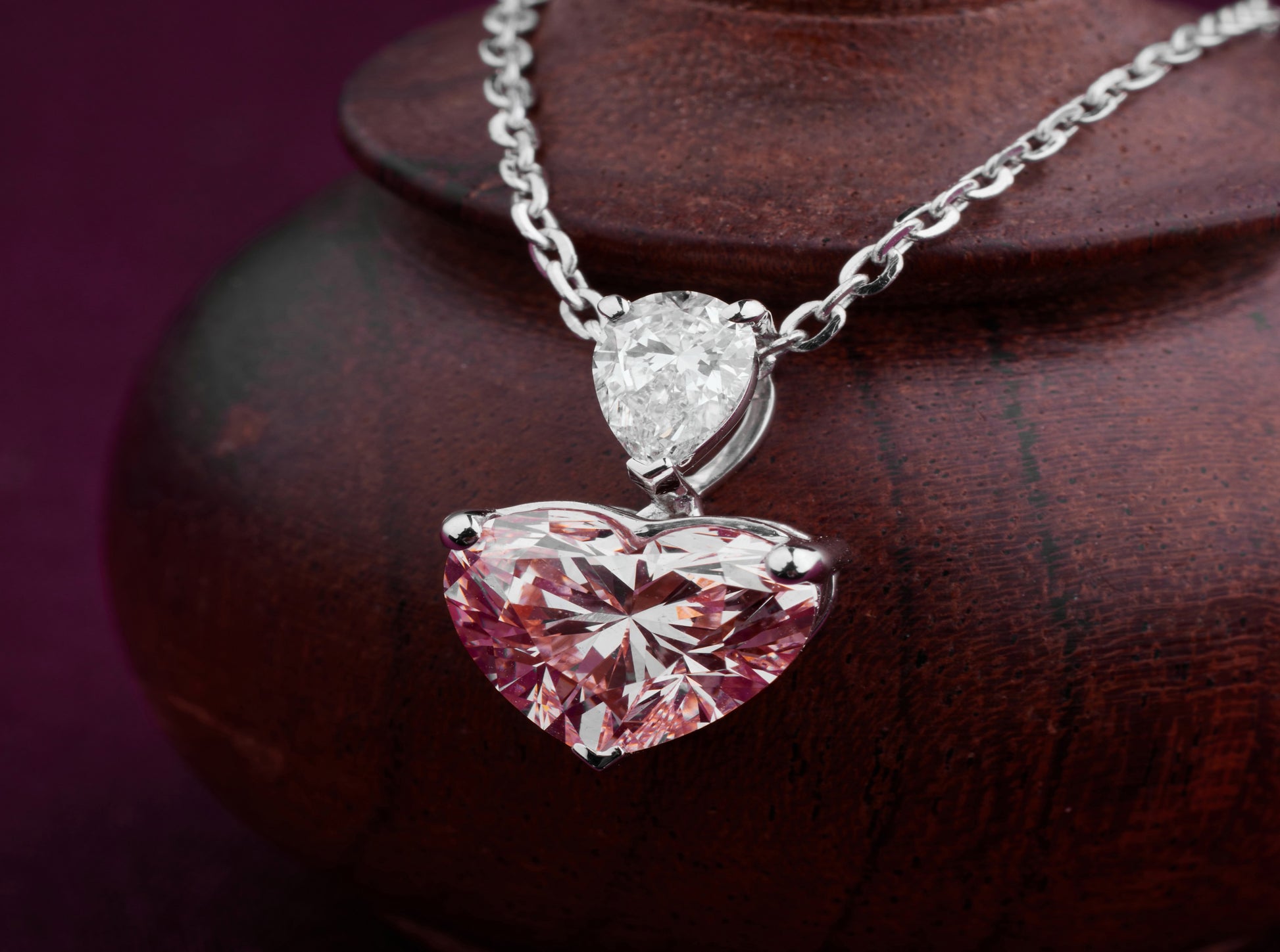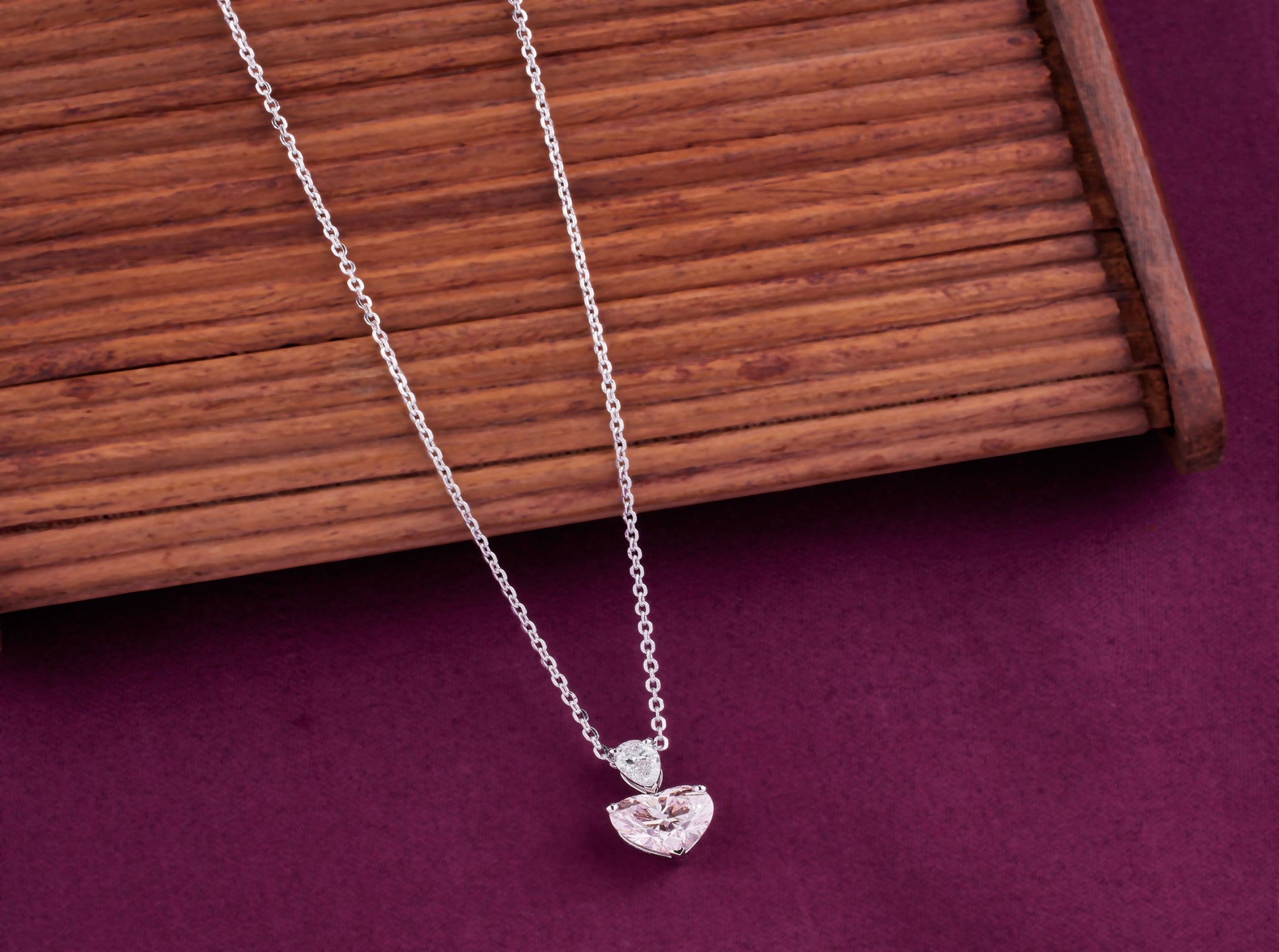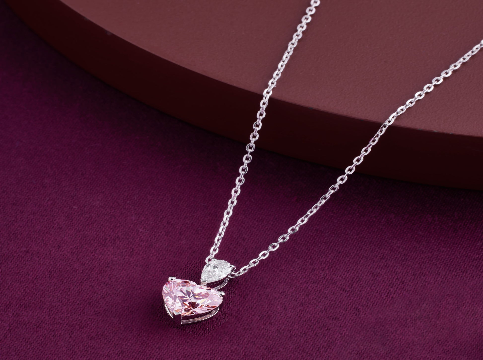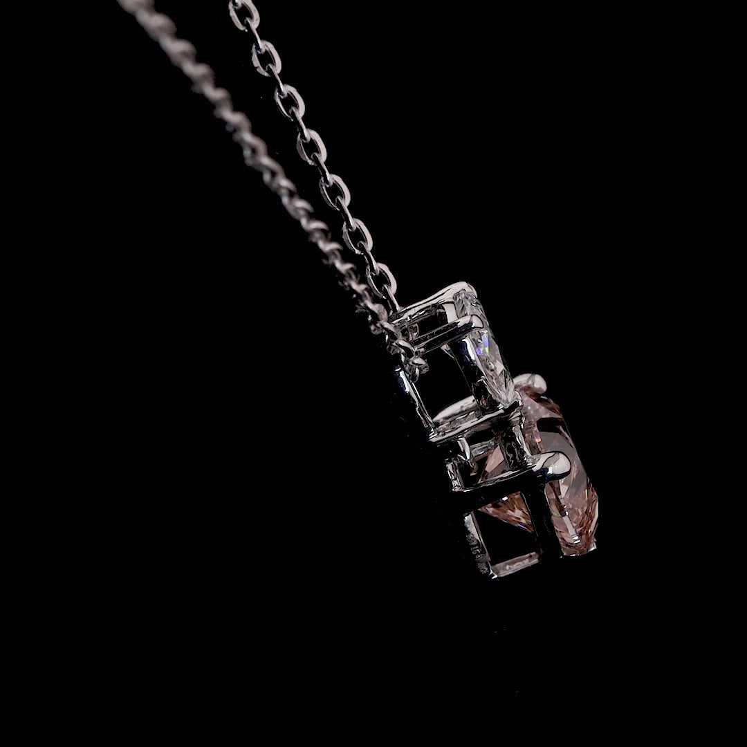 Blush Muse celebrates the magic of feminine charm with a captivating pink heart-shaped diamond. Suspended below a shimmering white pear diamond, this elegant design whispers of delicate emotions and sweet sentiments. It's a symbol of grace, admiration, and tender love.